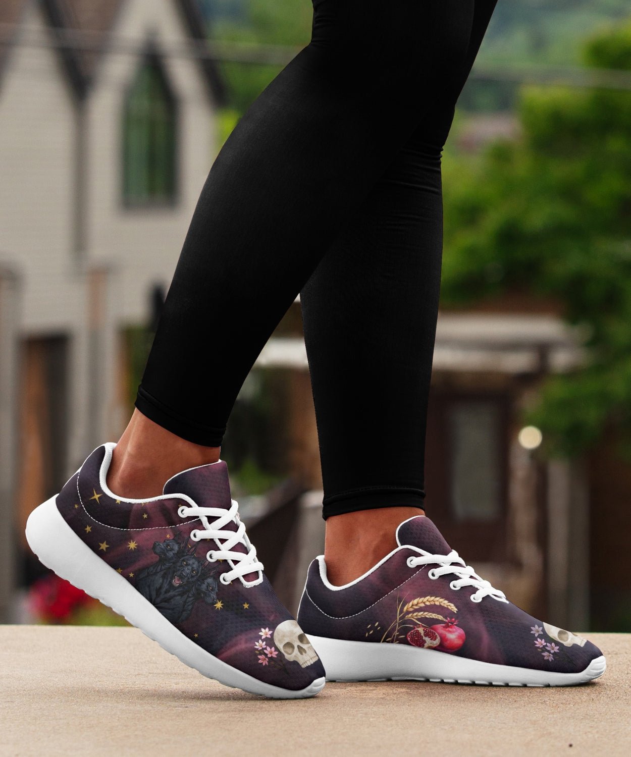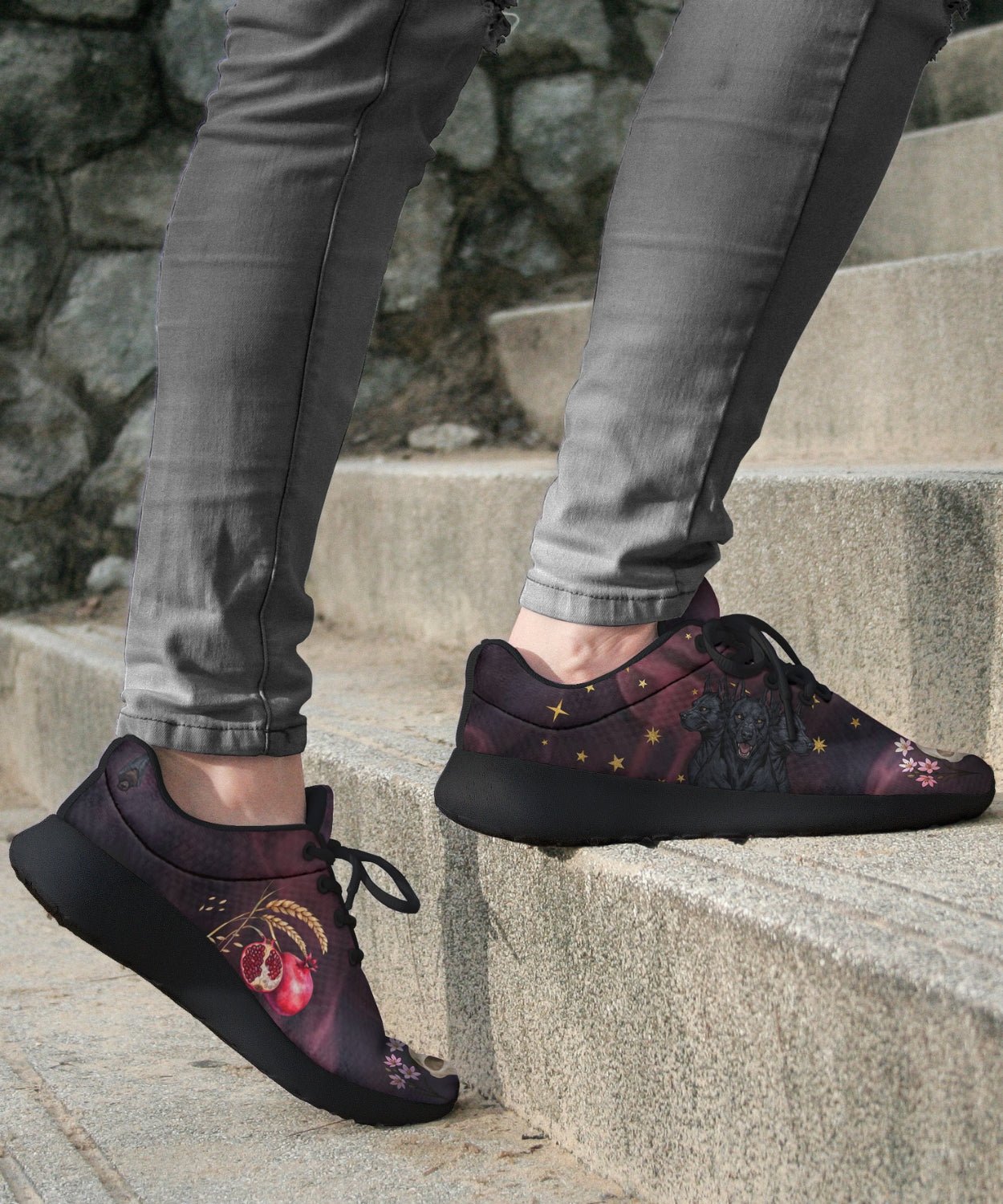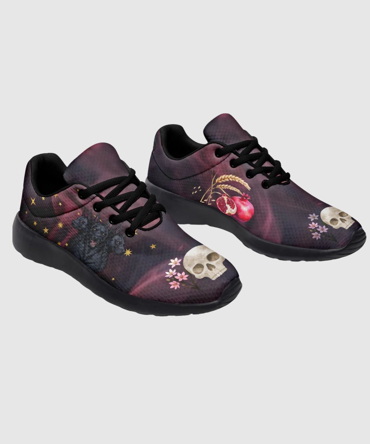 Step into myth and magic with the Persephone Sneakers inspired by the Goddess of Spring and Queen of the Underworld. These lightweight mesh lace-up sneakers feature the iconic symbols associated with the goddess including: Cerberus, pomegranates, skulls, barley, and asphodel flowers against a starry night sky.