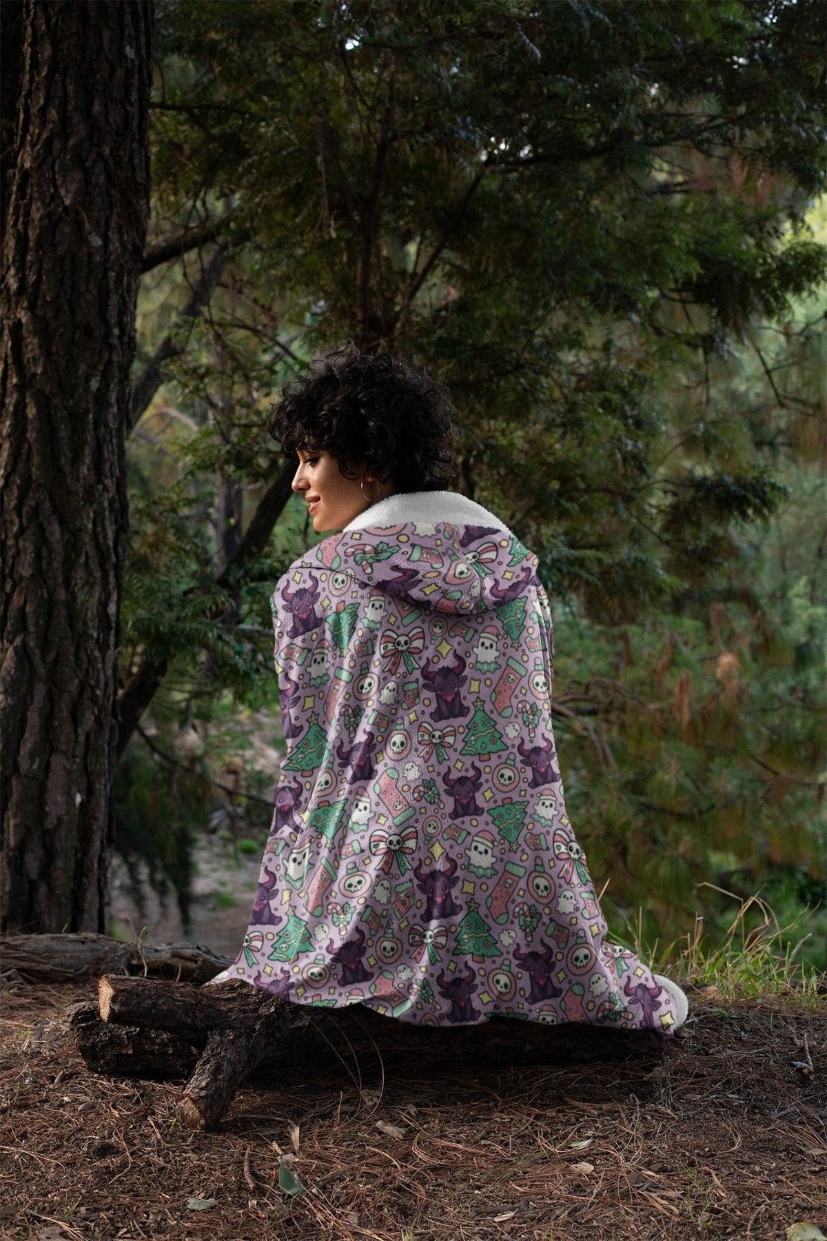 Stay cozy through the cold months with the Cute Krampus Hooded Blanket—a pastel-goth twist on holiday comfort. This ultra-soft blanket features an adorably spooky Krampus design surrounded by festive icons like skull bows, stockings, and stars.