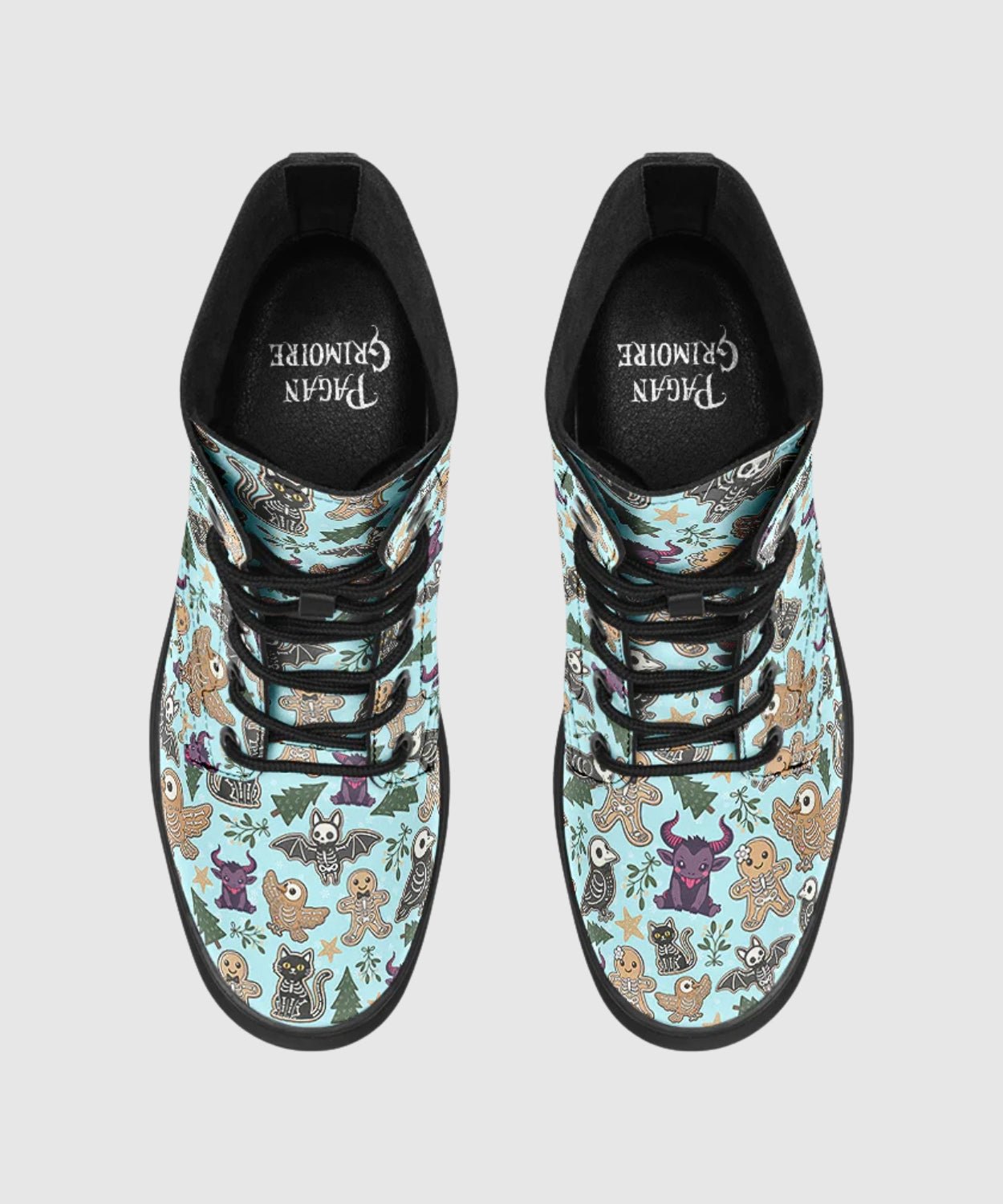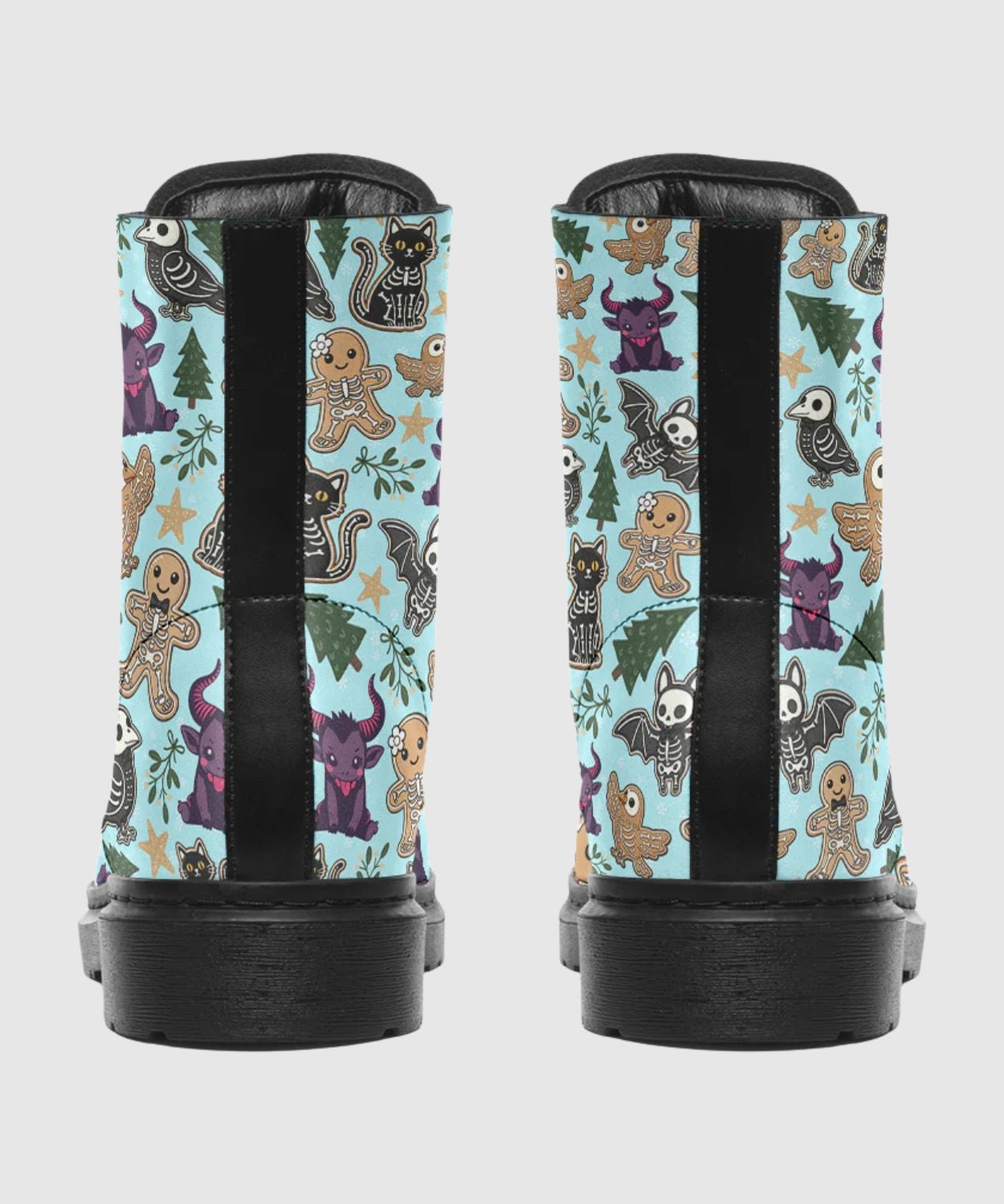 These Spooky Gingerbread Combat Boots turn cozy nostalgia into darkly festive style. Adorned with gingerbread skeletons, skull candy, and little Krampus accents on an icy blue background, they blend Yule sweetness with gothic edge.