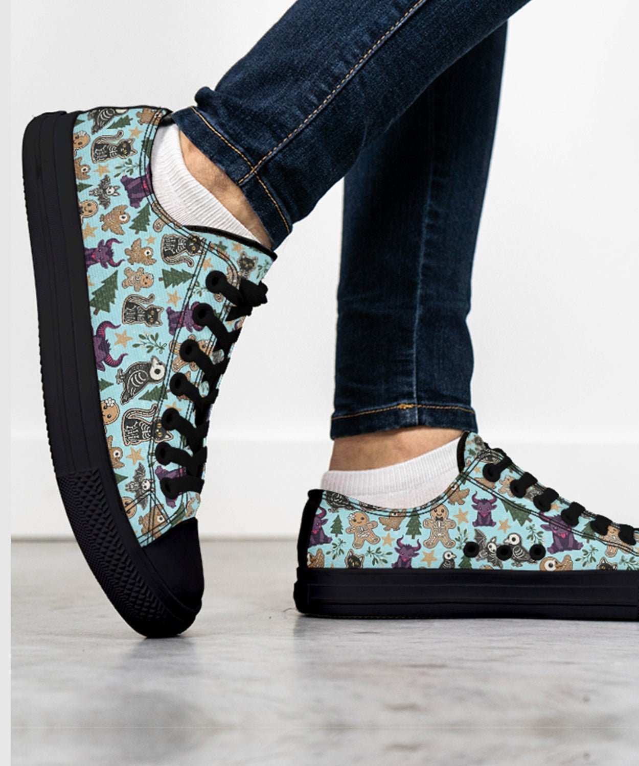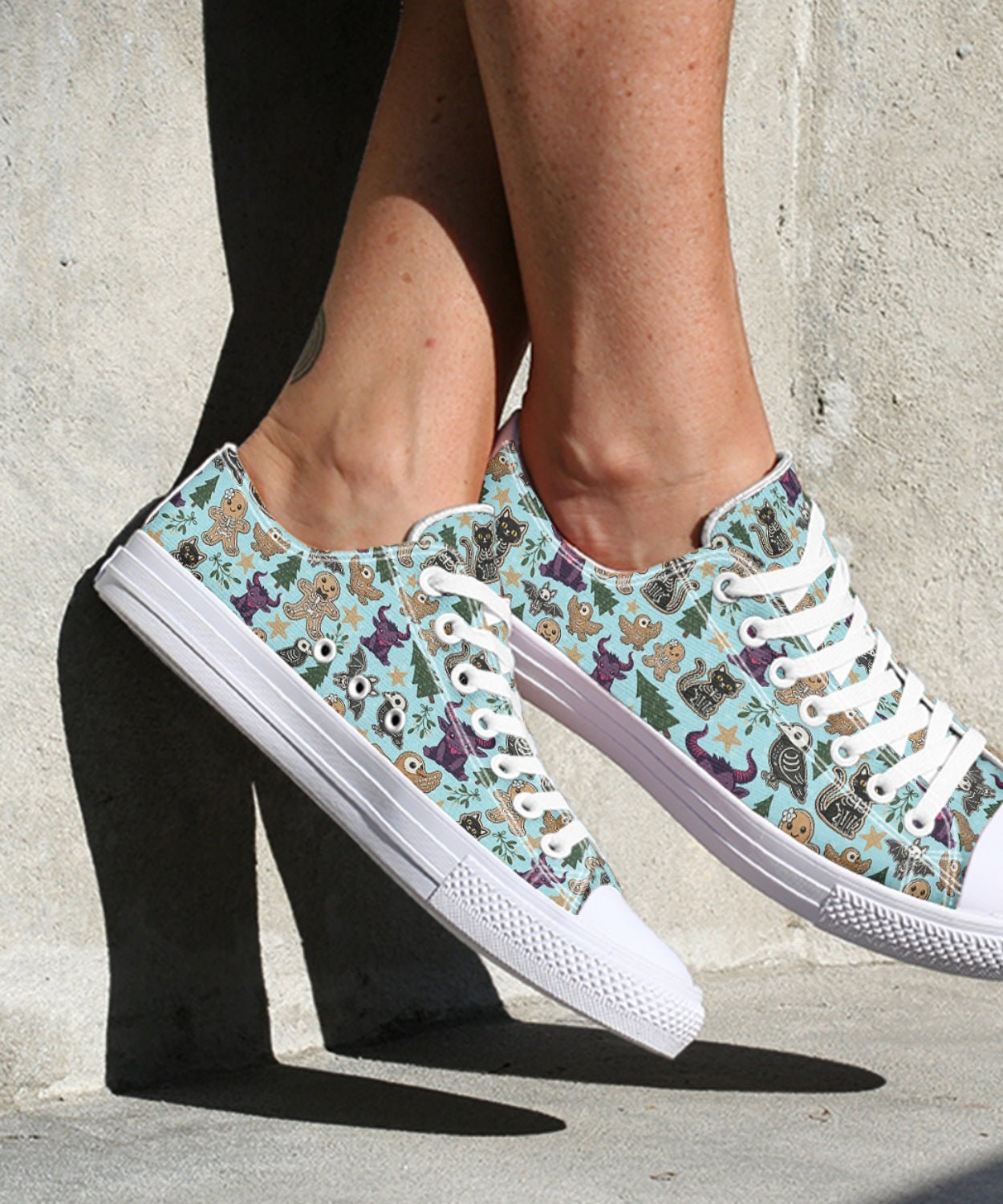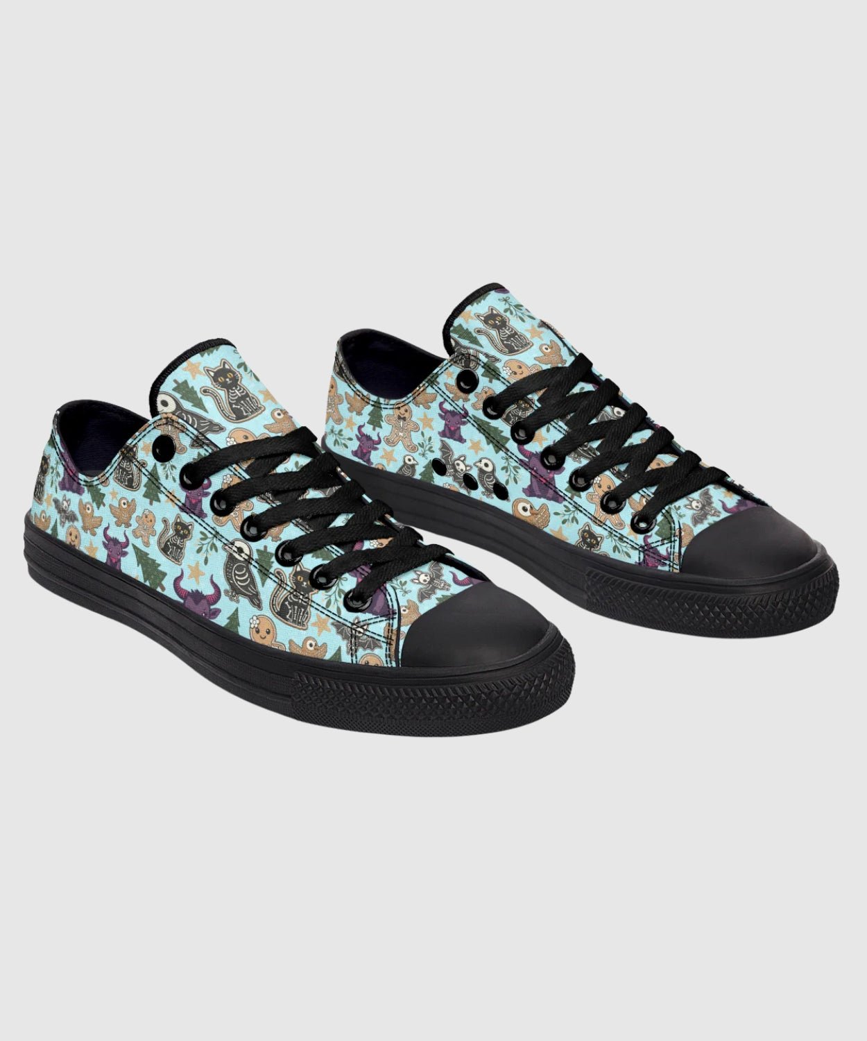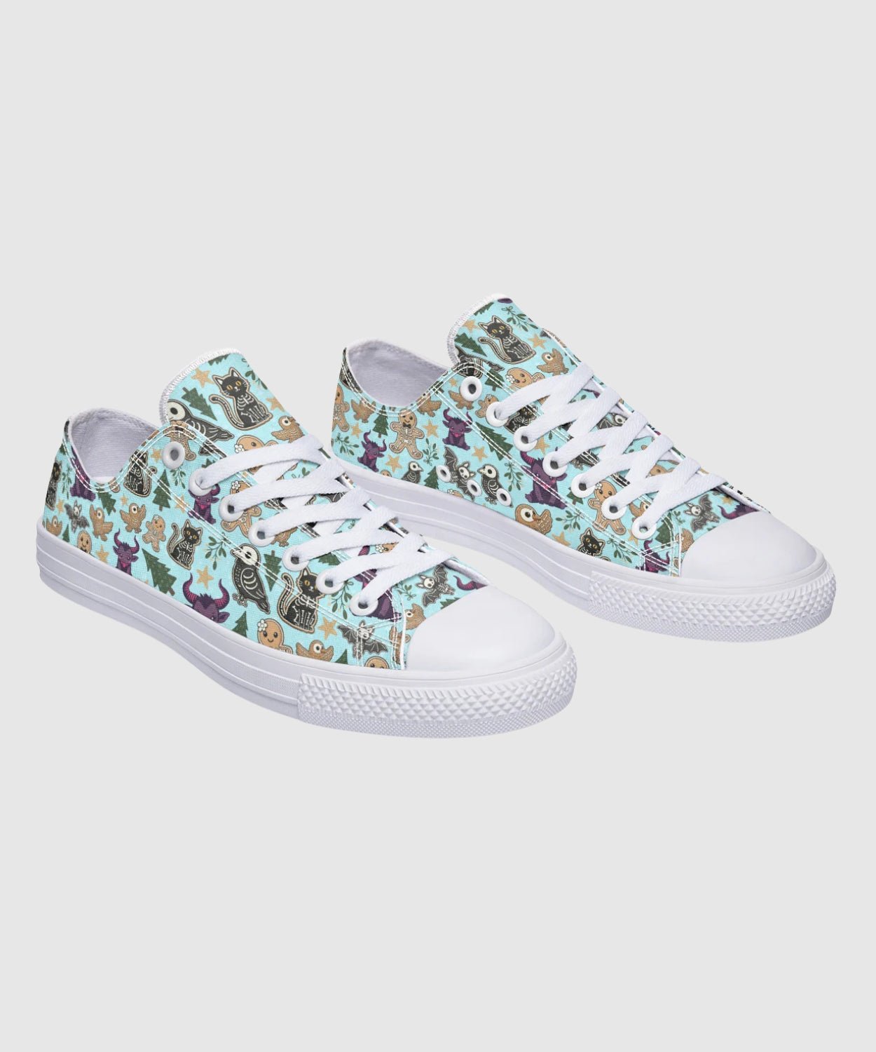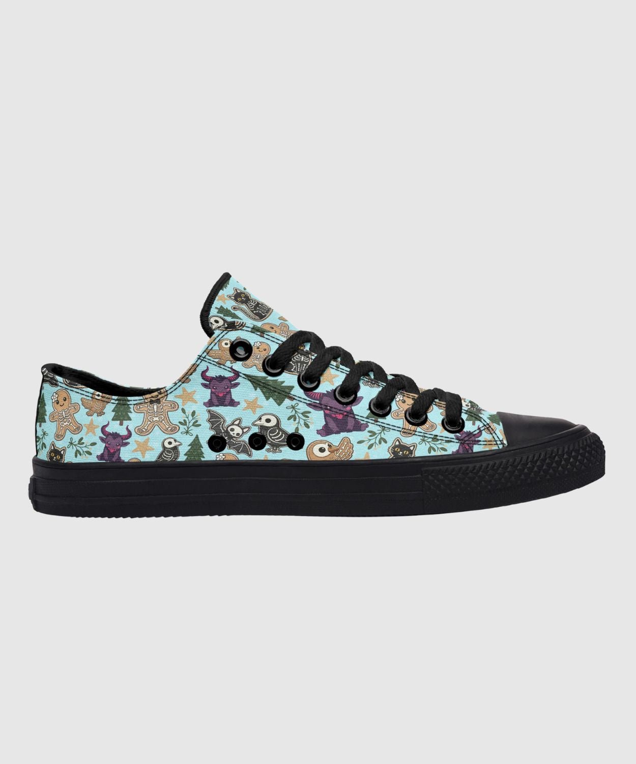 Meet the sweetest shade of spooky. These Spooky Gingerbread Low-Tops feature a playful mix of gingerbread skeletons, dark candy, and stars—perfect for pairing with jeans, skirts, or cozy sweaters.