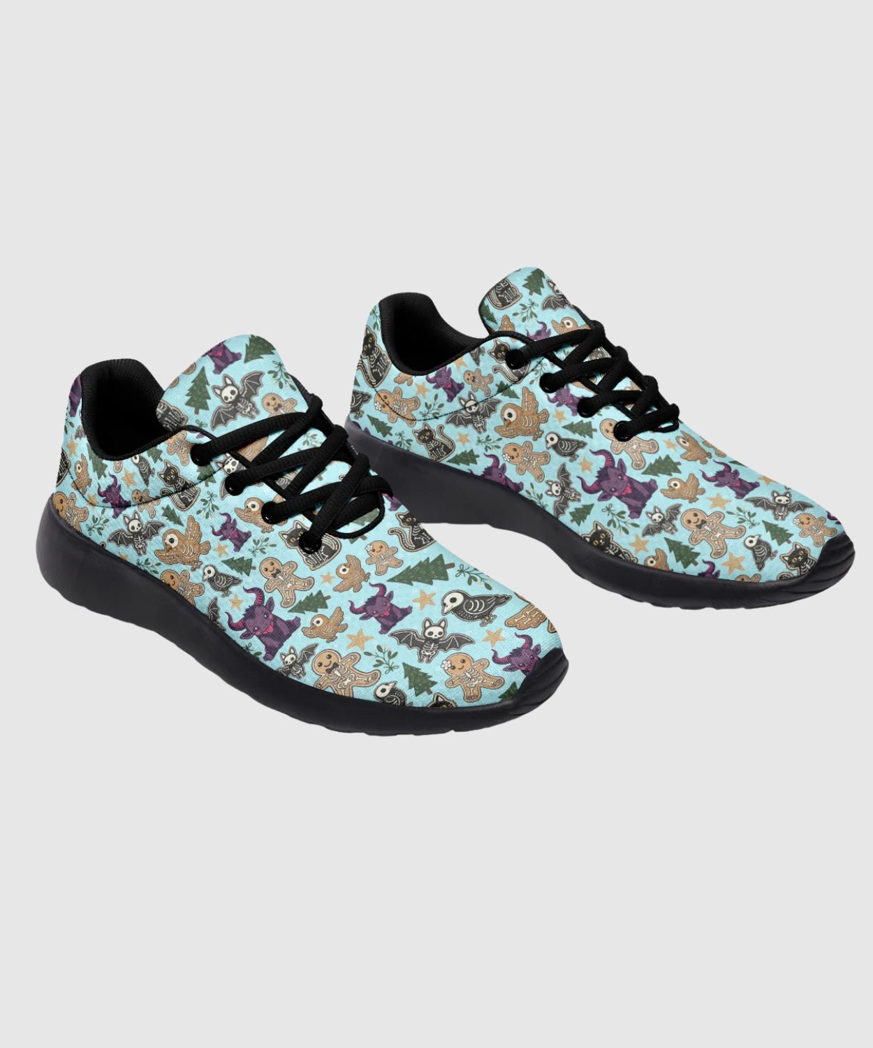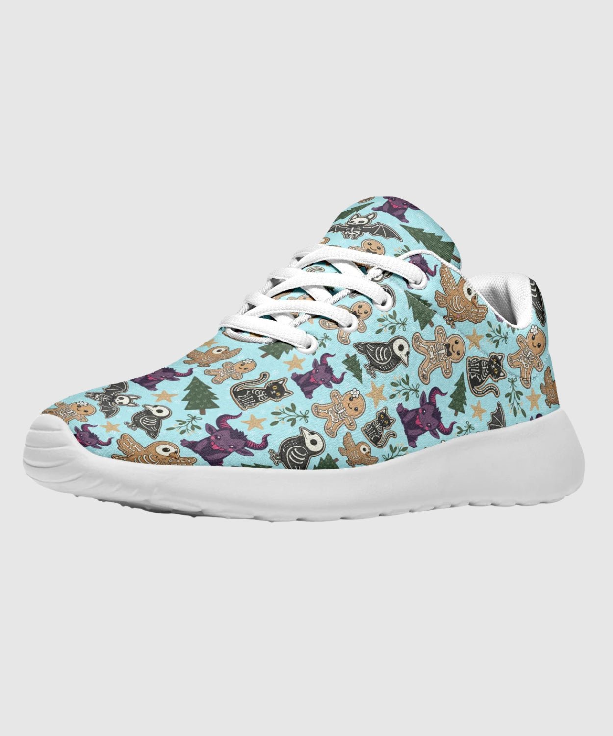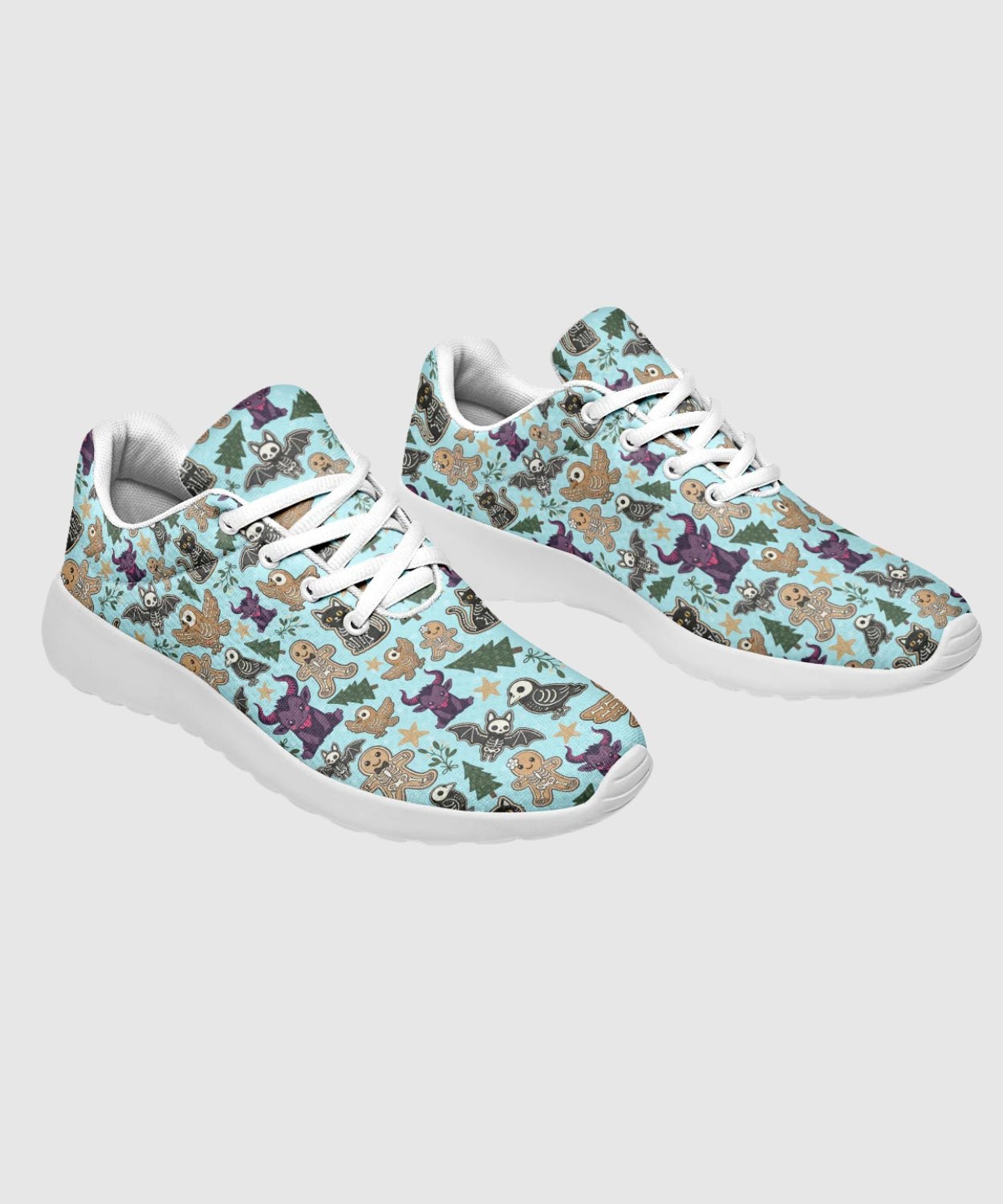 Add some sugar and a little fright to your step with Spooky Gingerbread Sneakers. The pastel-blue pattern of gingerbread skulls and skeleton candy transforms classic comfort into holiday rebellion.
