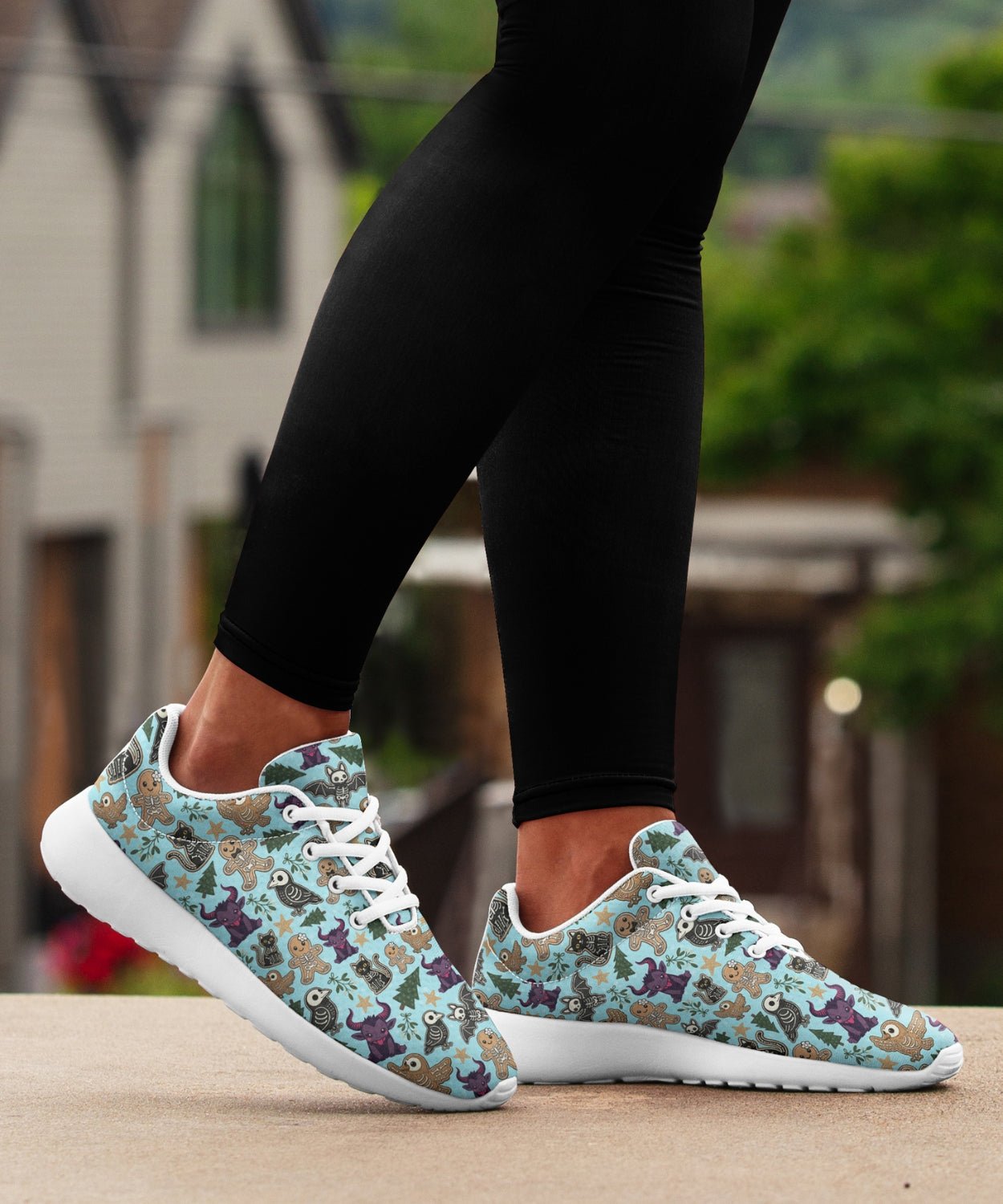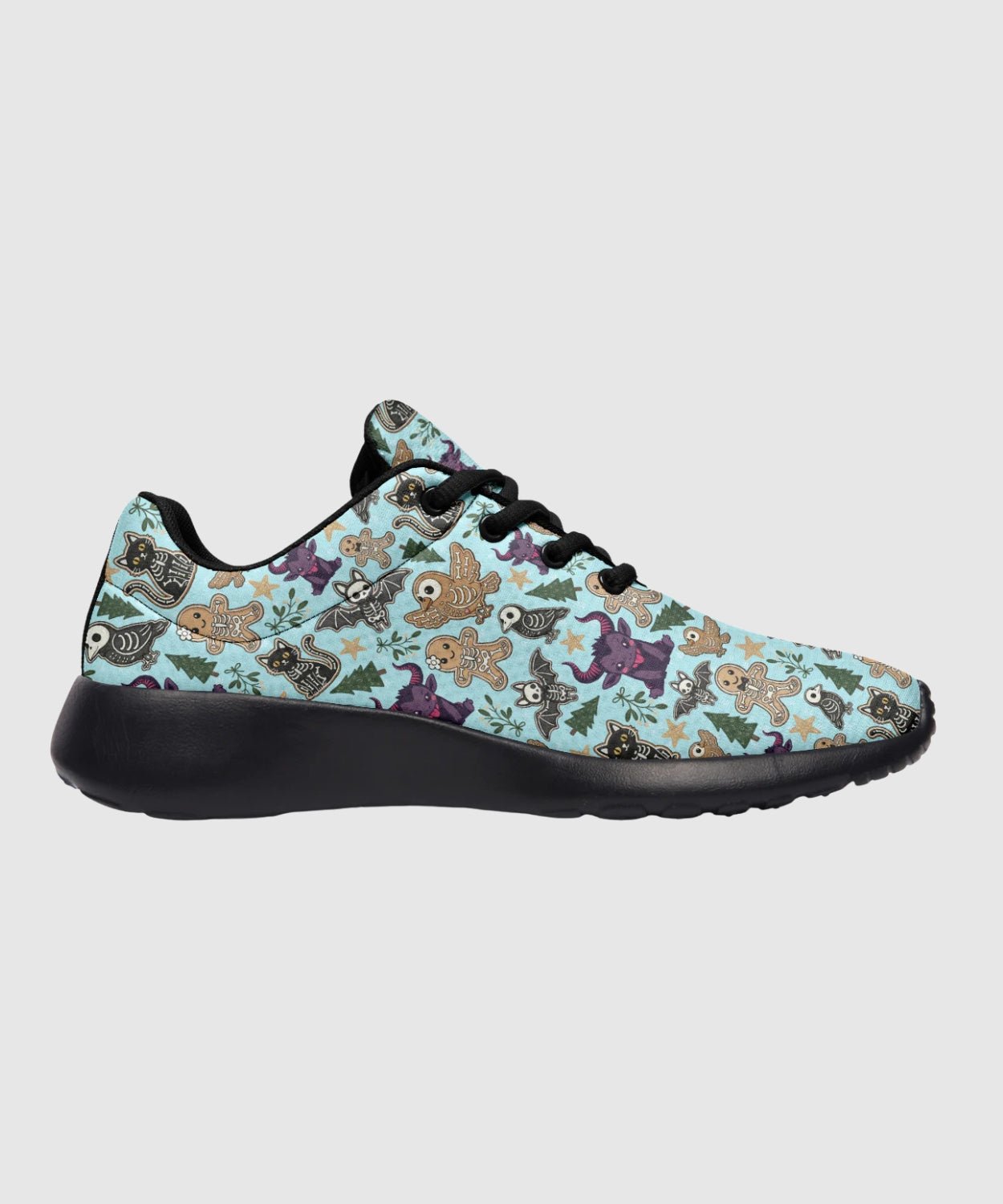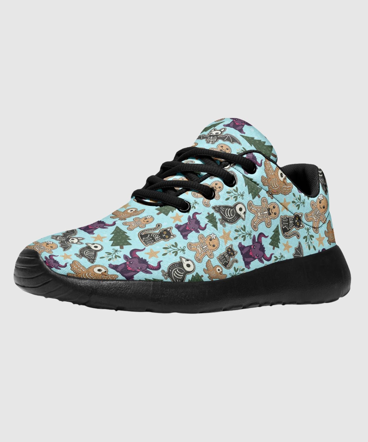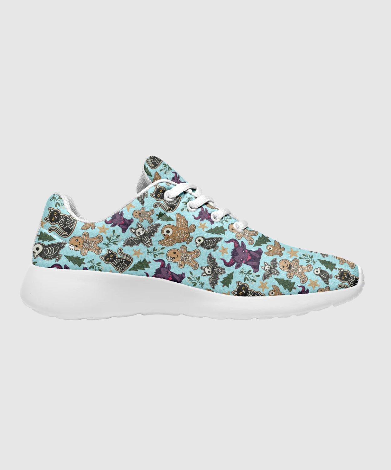 Add some sugar and a little fright to your step with Spooky Gingerbread Sneakers. The pastel-blue pattern of gingerbread skulls and skeleton candy transforms classic comfort into holiday rebellion.