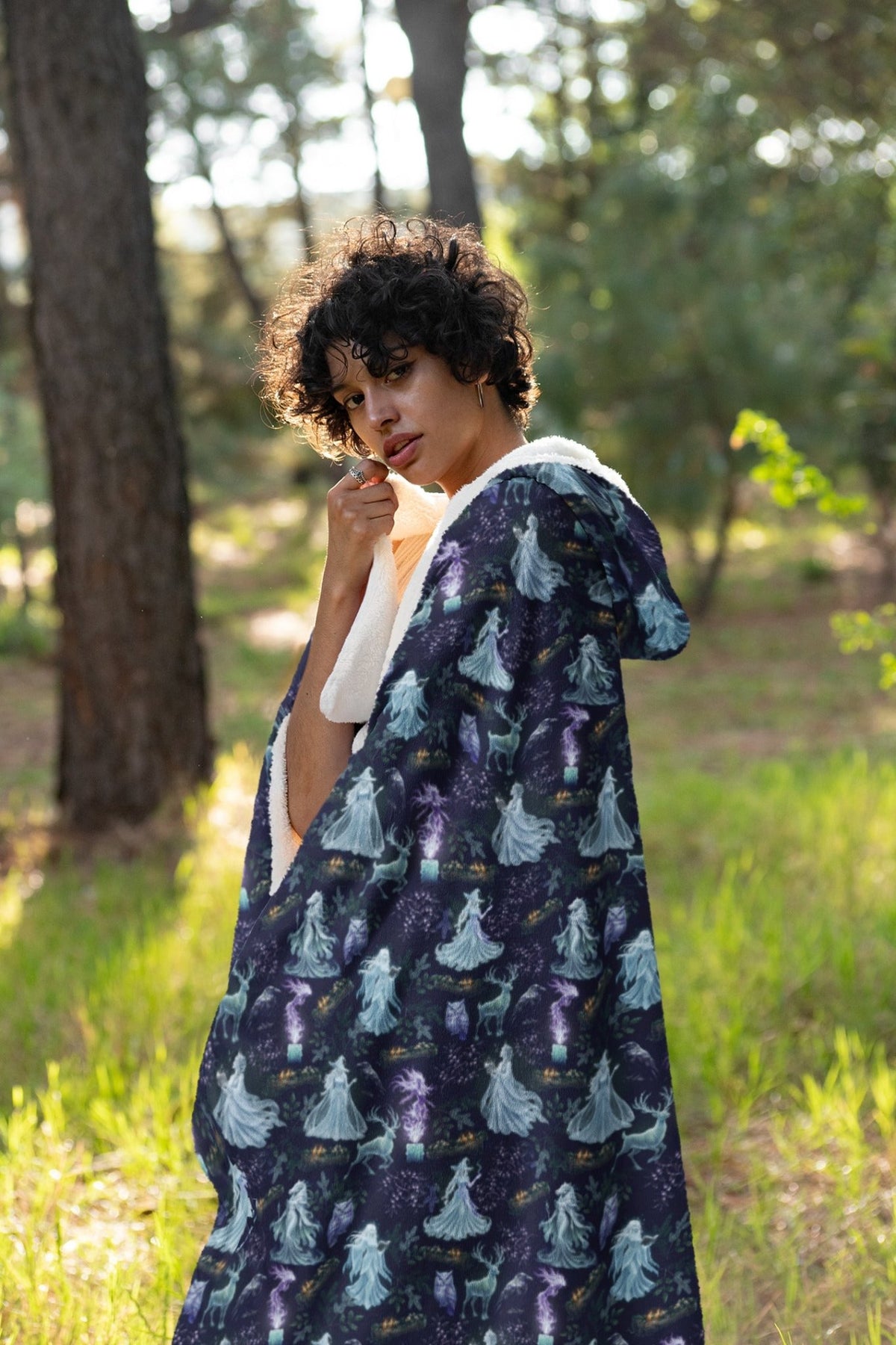 Soft faux-fur lining and a mystical print make this gothic winter blanket a must-have for witches who find beauty in the quiet and the haunted.