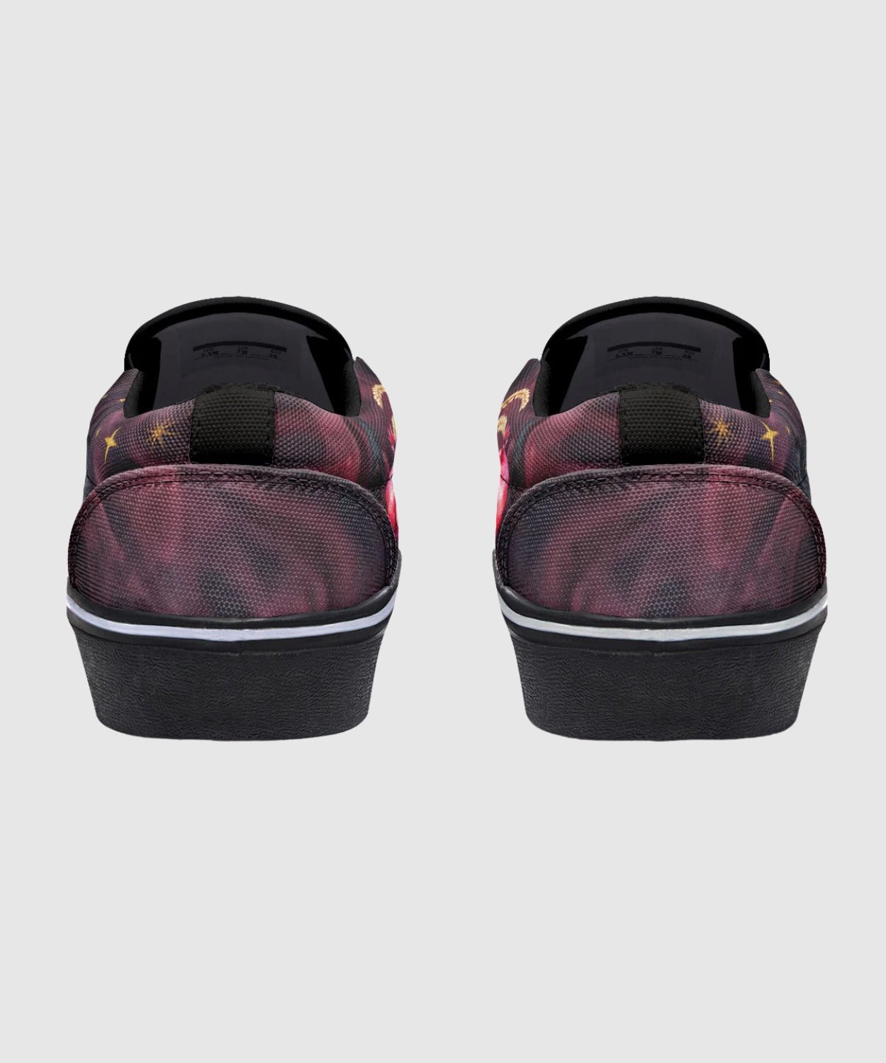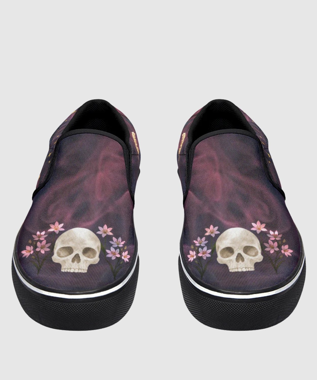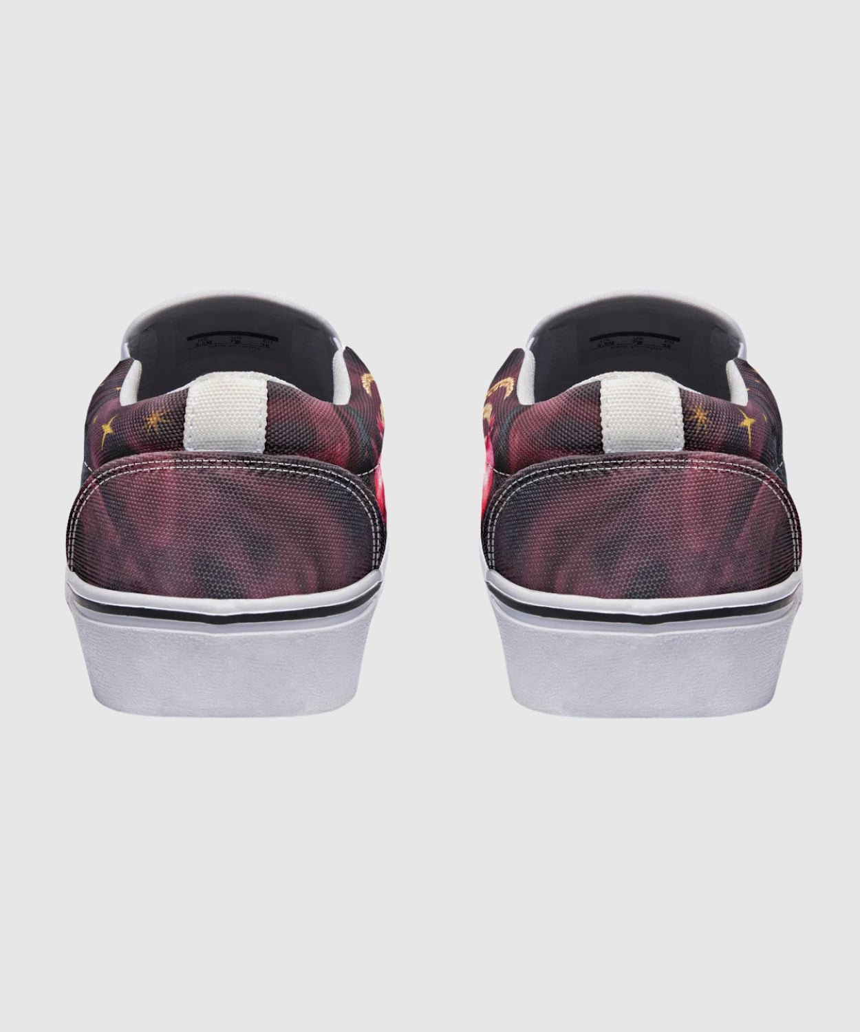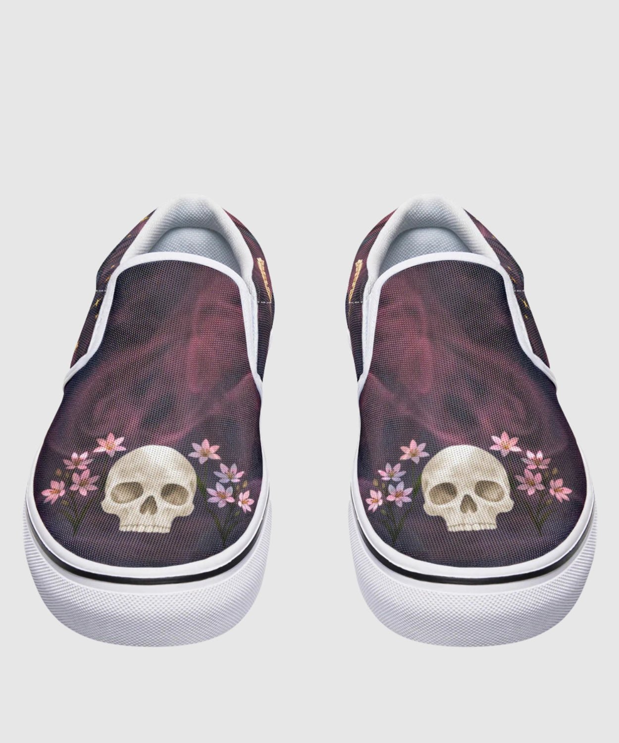 Step into mythology with the Persephone Sneakers inspired by the Goddess of Spring and Queen of the Underworld. These canvas slip-on sneakers feature the iconic symbols associated with the goddess including: Cerberus, pomegranates, skulls, barley, and asphodel flowers against a starry night sky.