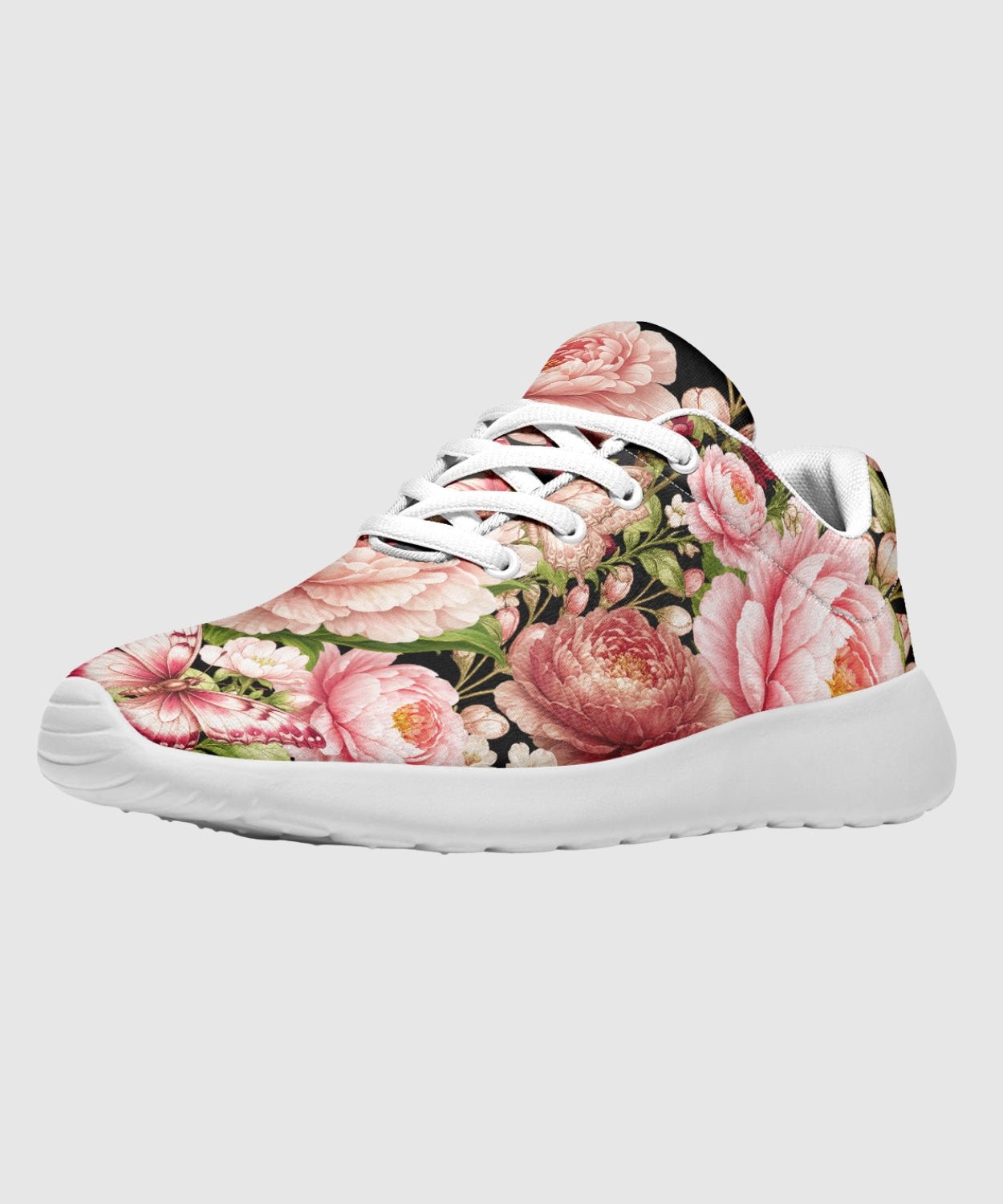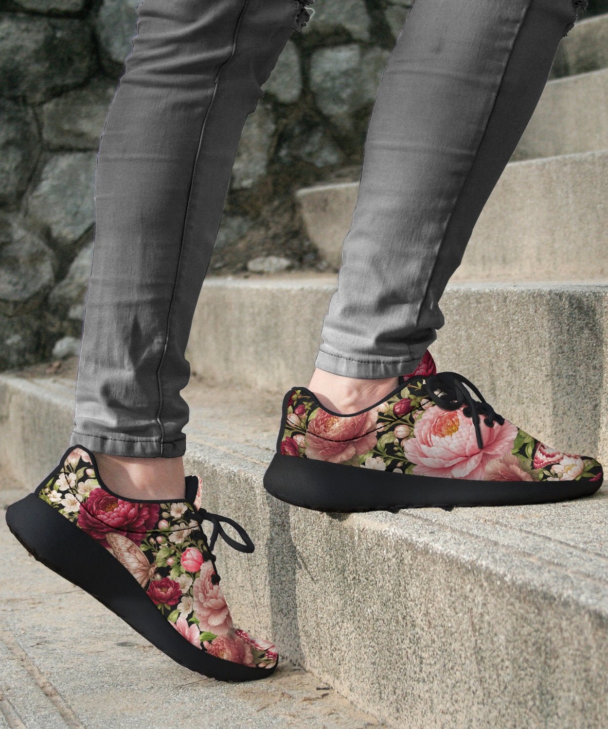 These Persephone Spring Sneakers feel like spring breaking through the underworld. Soft pink blooms and deep crimson florals spread across a shadowed base, grounded with a subtle edge that keeps them from ever feeling too sweet. Butterflies drift through the design, echoing transformation, rebirth, and the duality she embodies as goddess of spring and queen below.