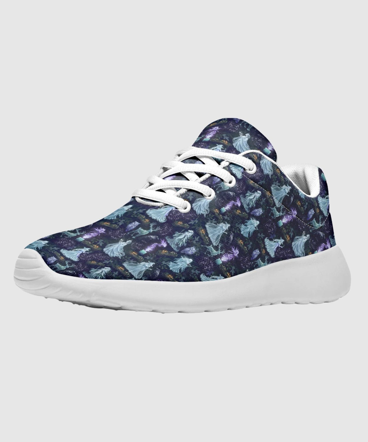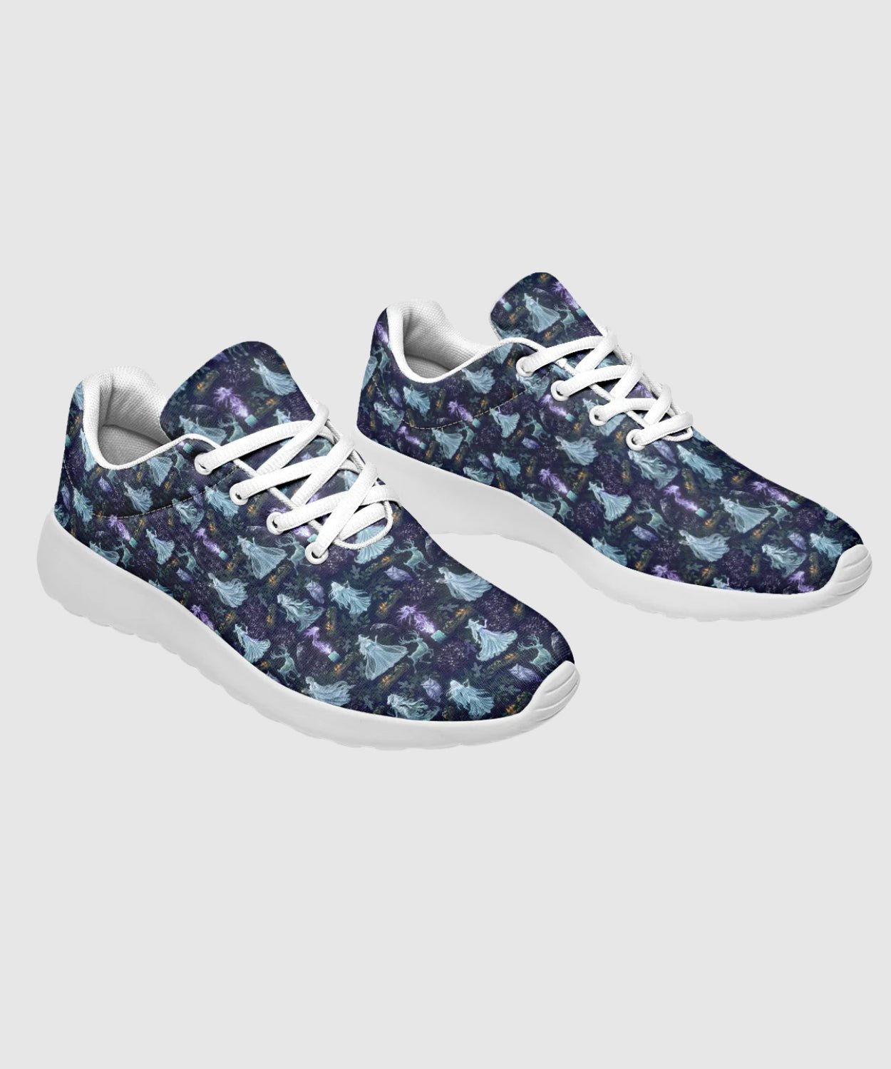 Step into the enchantment of midwinter nights with these Spooky Christmas Spirits Sneakers. Icy blues, spectral women, and candlelit forests create a story of gothic elegance.